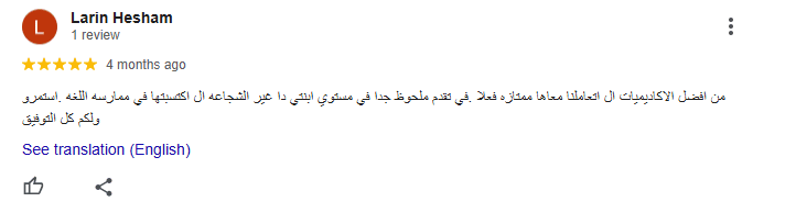 من افضل الاكاديميات ال اتعاملنا معاها ممتازه فعلا في تقدم ملحوظ جدا في مستوي ابنتي دا غير الشجاعه ال اكسبتها في ممارسه اللغه استمرو ولكم كل التوفيق