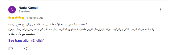 اكاديمية ممتازة في سرعة الاستجابه من وقت التسجيل والرد ع جميع الاسئله والمتابعه مع الطالب في الشرح والواجبات والمهام وإرسال تقرير مفصل ع مستوى الطالب في كل حصة . شرح المدرسين والمدرسات جميل و متناسب مع كل مرحله و