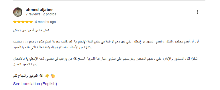 شكر خاص لمعهد مو إنجلش أود أن أتقدم بخالص الشكر والتقدير لمعهد مو إنجلش على جهودهم الرائعة في تعليم اللغة الإنجليزية. لقد كانت تجربة التعلم مثمرة ومميزة، واستفدت كثيرا من الأساليب المبتكرة والمهنية العالية التي يقدمها المعهد شكرا لكل المعلمين والإدارة على دعمهم المستمر وحرصهم على تطوير مهاراتنا اللغوية. أنصح كل من يرغب في تحسين لغته الإنجليزية بالالتحاق بهذا المعهد المميز إكل التوفيق والنجاح لكم