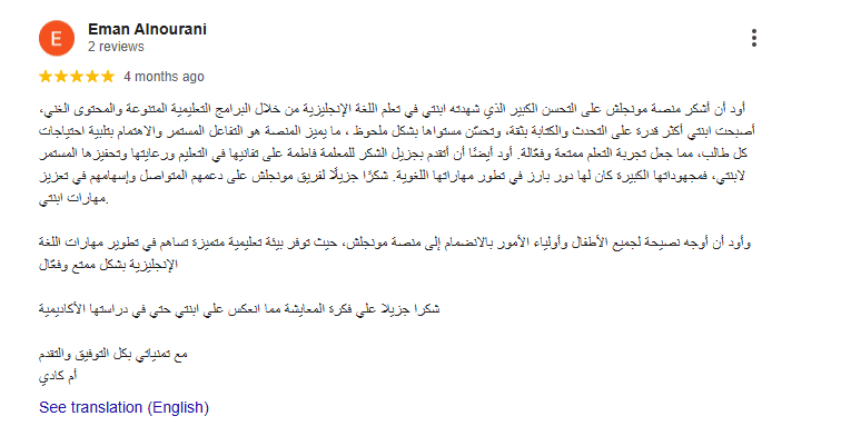 “ما يميز Monglish هو أسلوب التدريس العملي، حيث لا يقتصر الأمر على القواعد فقط، بل يعتمد على الممارسة الفعلية. أطفالي الآن يتكلمون الإنجليزية وكأنها لغتهم الثانية!”