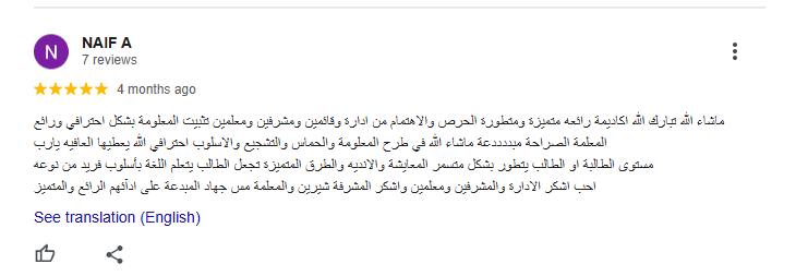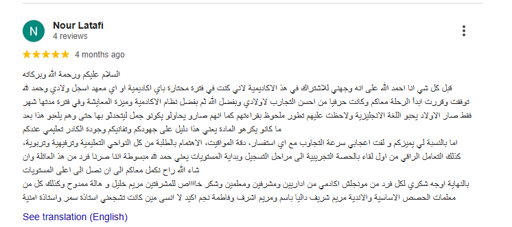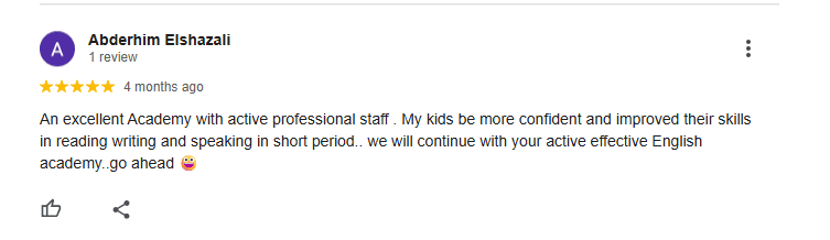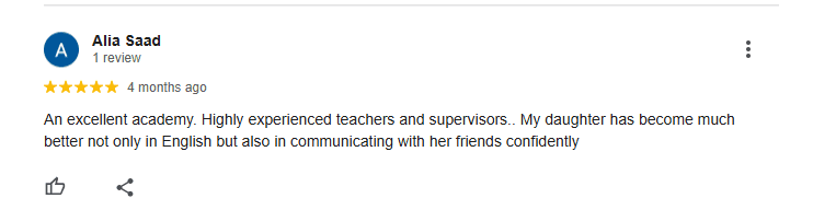 أكاديمية ممتازة بطاقم عمل محترف ونشط. أصبح أطفالي أكثر ثقة بأنفسهم وتحسنت مهاراتهم في القراءة والكتابة والمحادثة في وقت قصير. سنواصل مع أكاديميتكم النشطة والفعالة للغة الإنجليزية. تفضلوا.