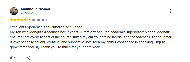 تجربة ممتازة ودعم متميز ابني في أكاديمية مونجليش منذ عامين. منذ اليوم الأول، حرصت المشرفة الأكاديمية "منة مدحت" على أن تناسب جميع جوانب الدورة احتياجات طفلي التعليمية، والمعلمة "هدير جمال" تتميز بصبرها وإبداعها ودعمها الاستثنائي. لقد لاحظتُ نمو ثقة طفلي في التحدث باللغة الإنجليزية بشكل ملحوظ، شكرًا جزيلاً لكِ على جهودكِ.